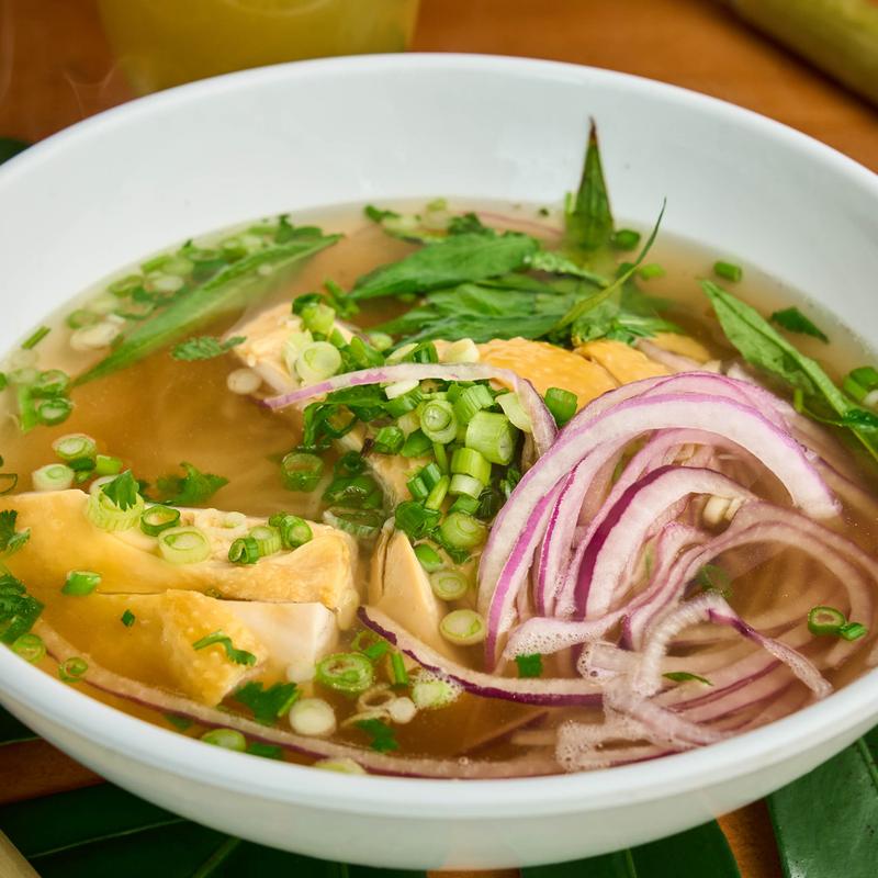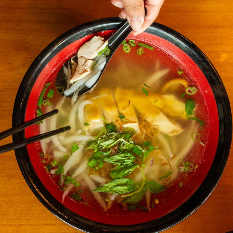 Clear noodles served in chicken broth, green onions, cilantro, fried shallots, and Vietnamese coriander leaves.