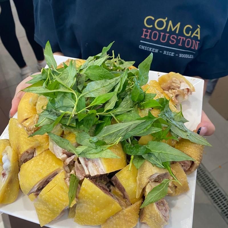 Gà Nguội | Chicken Served Cold • All rice dishes served with fragrant rice, lettuce, cucumber, pickled cabbage, carrot, and ginger, topped with ginger & onion oil and Vietnamese coriander leaves. Served with ginger sauce and a cup of chicken broth on the side.